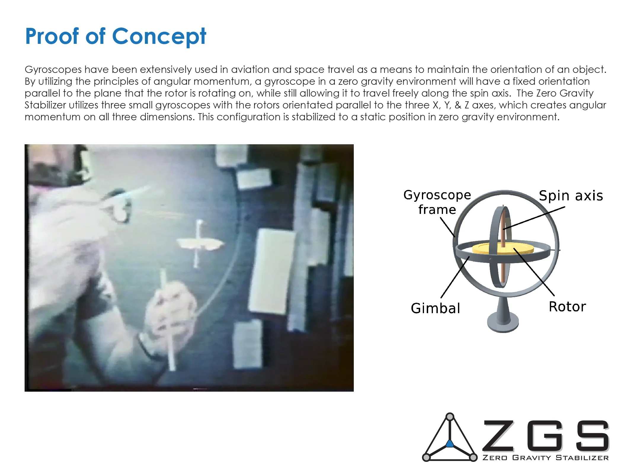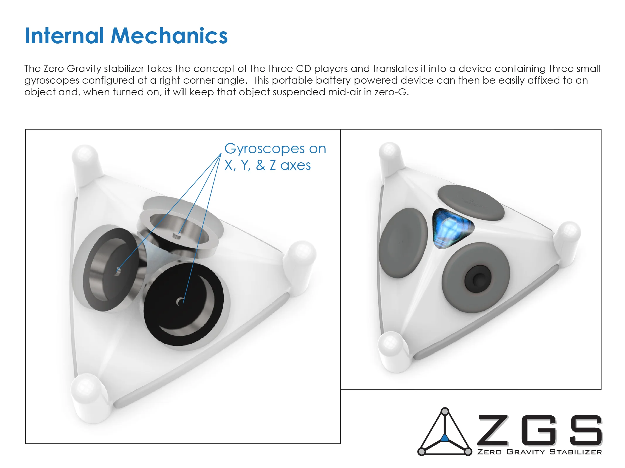 The Zero Gravity Stabilizer (ZGS) is an electronic device specifically designed for a zero-gravity environment. With this battery-powered device you are able to stabilize almost any object in zero-G. Simply attach it to an object, position the object to your preference, and turn the ZGS on. The ZGS utilizes a gyroscope on each of the three axis to ensure static positioning in mid-air, preventing the stabilized object to from floating away.